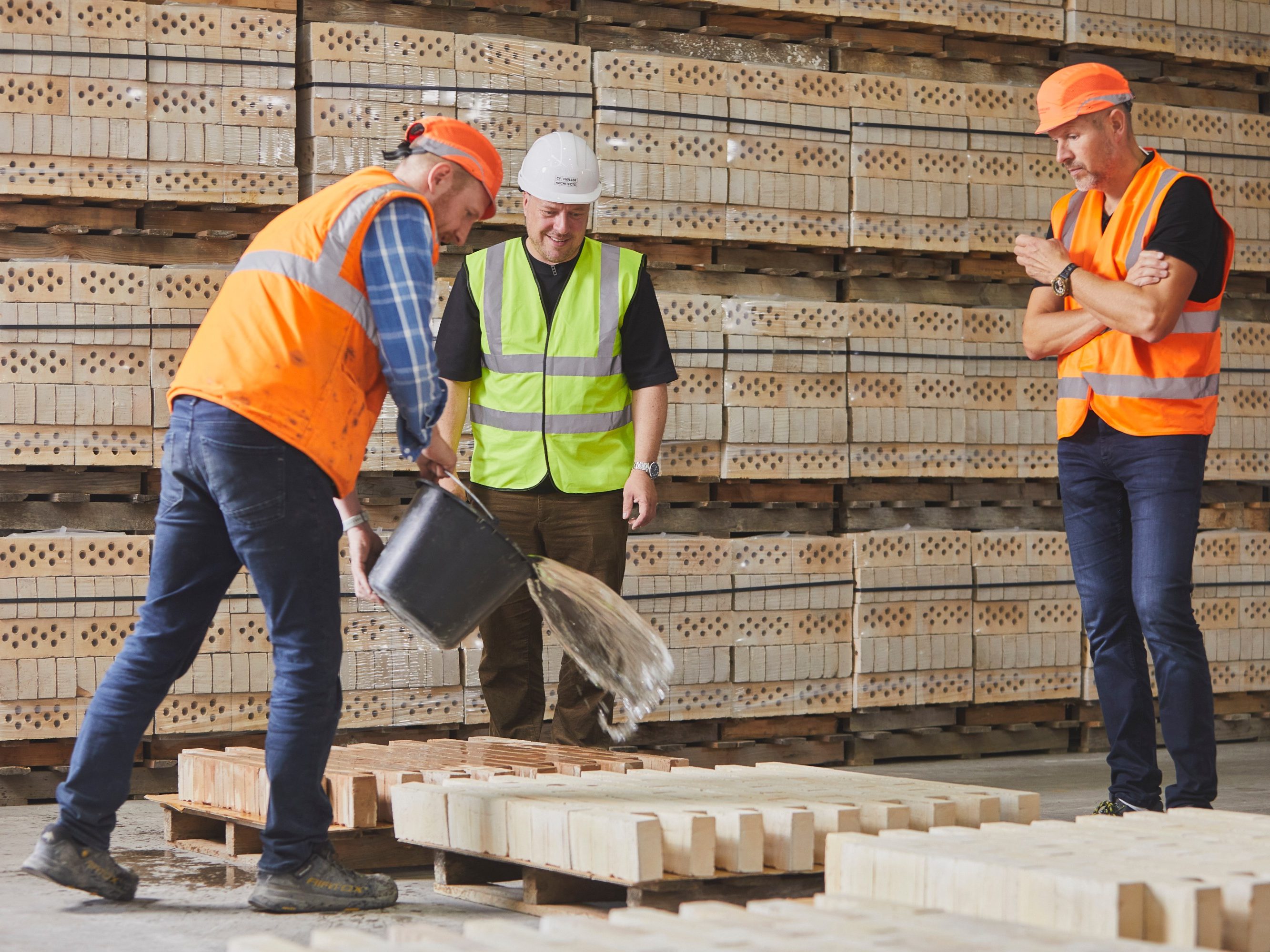 MIX veier 15 prosent mindre enn en tradisjonell, bløtstrøken teglstein fordi den produseres som vår dematerialiserte LESS-teglstein. MIX er derfor enklere å håndtere på byggeplassen og er bedre for arbeidsmiljøet. Ved å skifte fra en massiv teglstein til MIX kan en murer løfte ca. 48 tonn mindre i året.*»